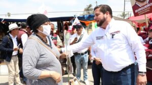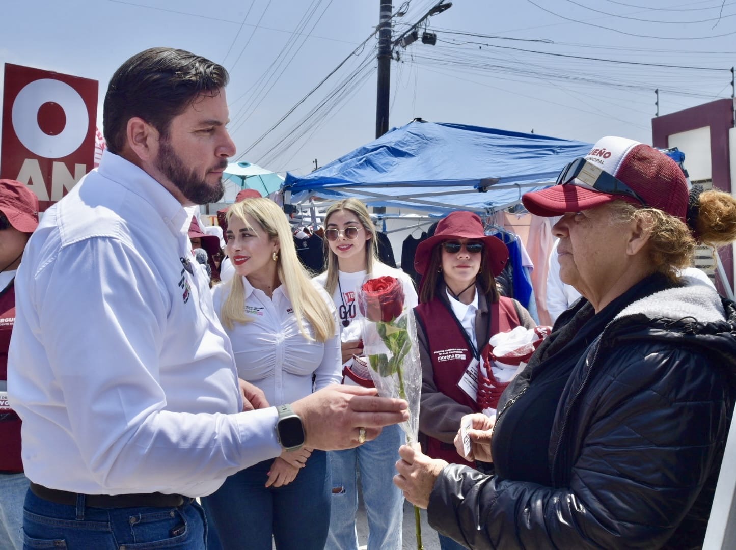 El candidato de MORENA, Ismael Burgueño Ruiz aprovechó un recorrido por el sobre ruedas de Módulos 2 en Otay para obsequiar flores con motivo del Día de las Madres, a las mujeres que acudían a proveerse de despensa y otros enseres en este mercado, así como a quienes son comerciantes.