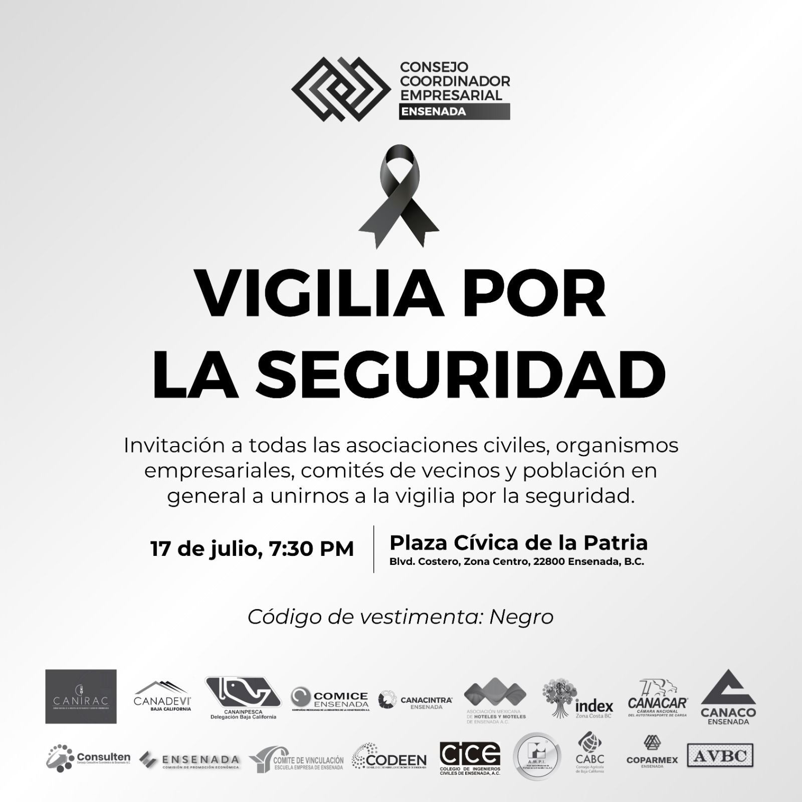 Citamos este próximo *miércoles 17 de Julio, a las 7:30 pm, para concentrarnos en la Plaza Cívica de la Patria*, ubicada en Boulevard Costero, de la Ciudad de Ensenada.