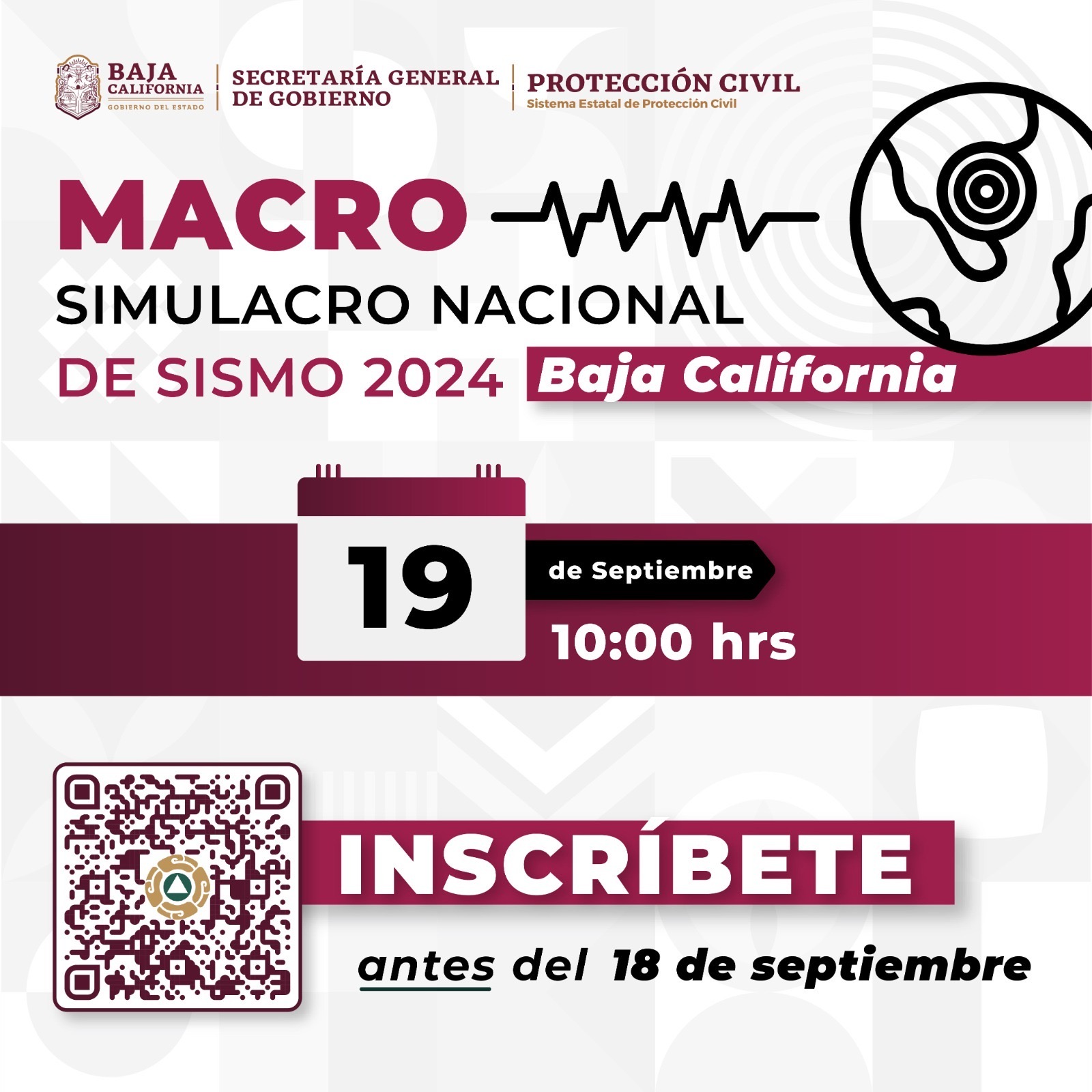MEXICALI.– La Coordinación Estatal de Protección Civil (CEPC) de Baja California invita a toda la ciudadanía a sumarse al Macrosimulacro Nacional 2024, que se llevará a cabo de manera simultánea en todo el país el próximo jueves 19 de septiembre.