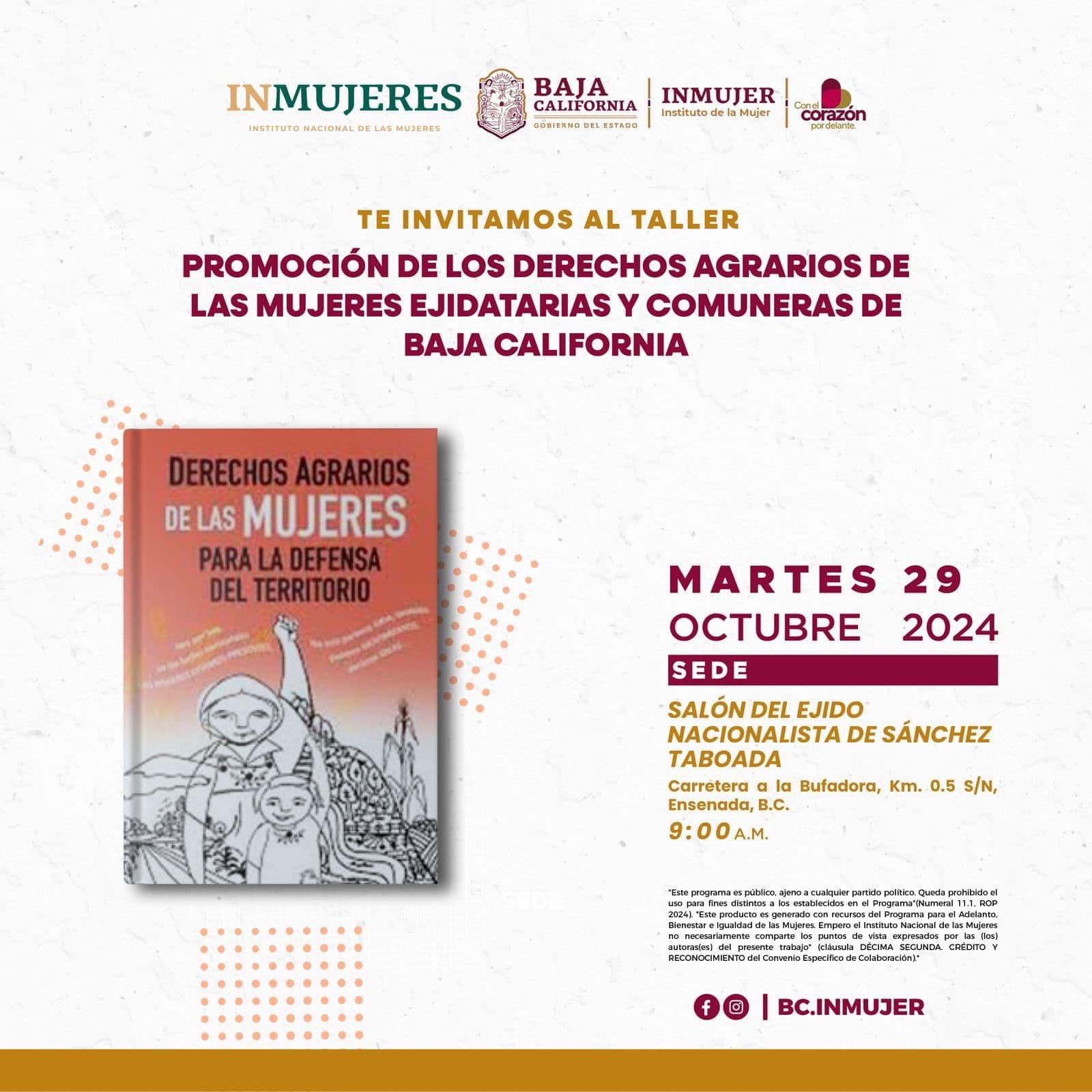 INMUJER BC en coordinación con INMUJERES invitan a todas las mujeres Ensenadenses a formar parte del “Taller de Promoción de los derechos agrarios de las mujeres ejidatarias y comuneras de Baja California” el cual se llevará a cabo en el Salón del Ejido Nacionalista de Sánchez Taboada este martes 29 de octubre a las 9:00 AM.