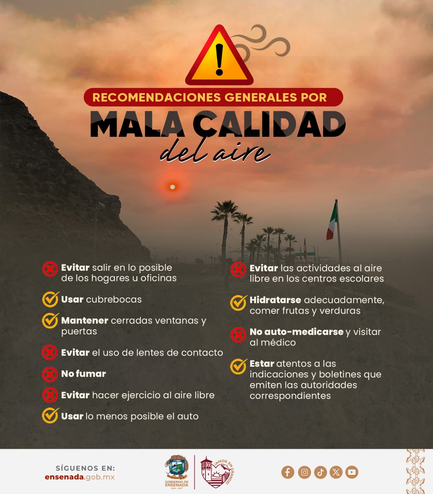 *Con base en los monitoreos que se realizan en la estación ICAARO del Instituto de Investigaciones Oceanológicas de la UABC, en el que indican que en la ciudad de Ensenada la calidad del aire es “peligrosa”, el Gobierno de Ensenada emite las siguientes recomendaciones:*