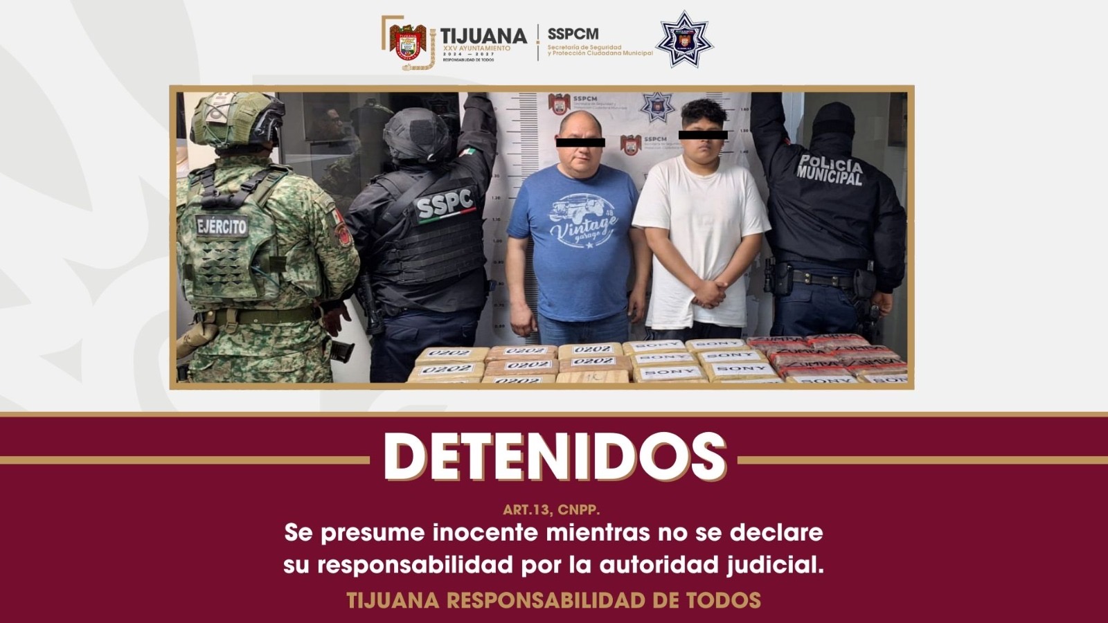 Tijuana, Baja California a 9 de mayo de 2025.- La Secretaría de Seguridad y Protección Ciudadana Municipal (SSPCM), aseguró a dos personas con 34 paquetes que contenían una sustancia blanca similar a la droga conocida como cocaína, con un peso total aproximado de 39.49 kilogramos, en la colonia Costa Azul.