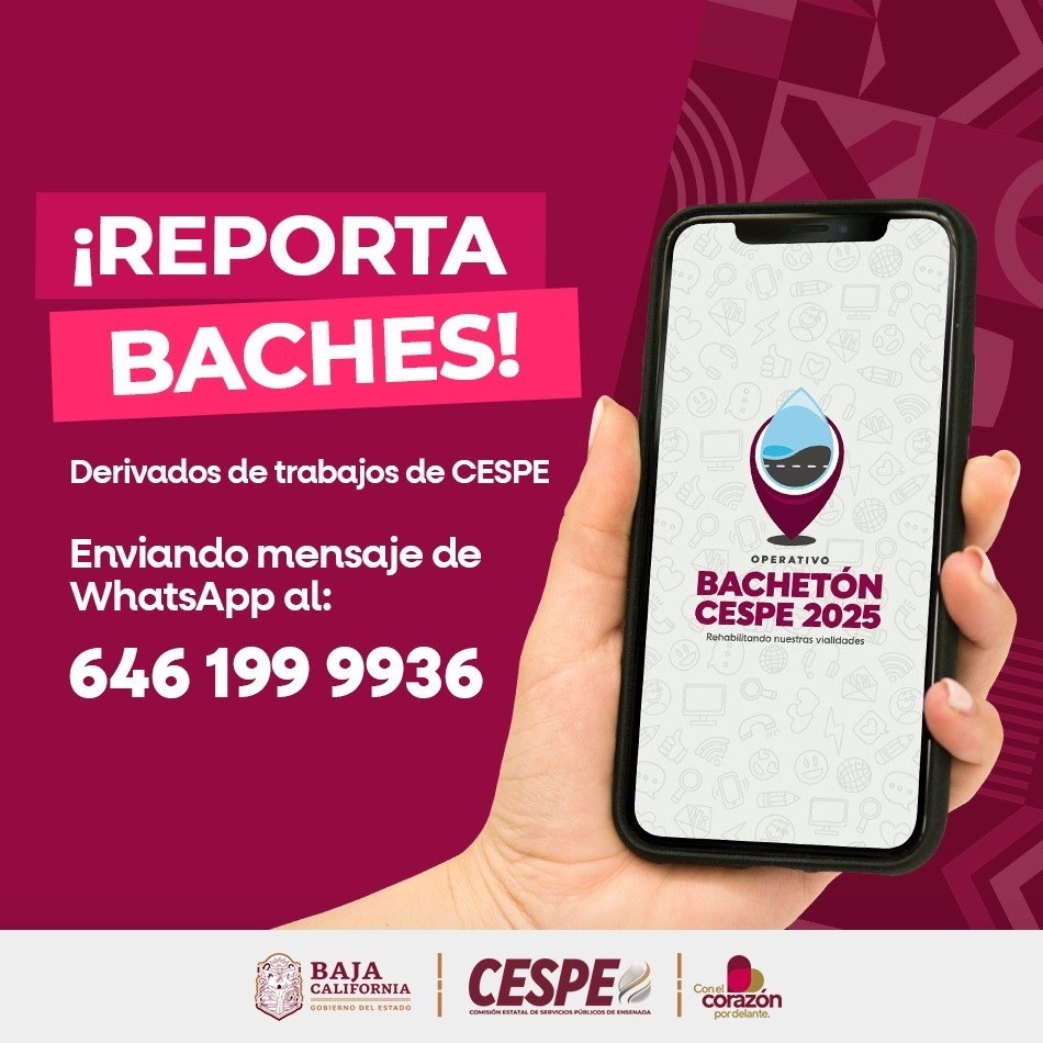 ENSENADA.- Con la finalidad de que la ciudadanía pueda reportar algún bache derivado de trabajos de reparación en la infraestructura hídrica, la Comisión Estatal de Servicios Públicos de Ensenada (CESPE) pone a disposición el número de WhatsApp 646-199-99-36 como un medio adecuado para que éste sea atendido.