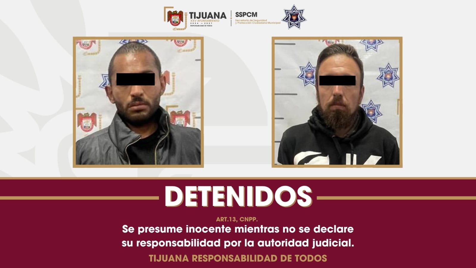 *Tijuana, Baja California, a 29 de mayo de 2025.* La Secretaría de Seguridad y Protección Ciudadana Municipal (SSPCM) informa que elementos de la Policía Municipal detuvieron a dos hombres señalados como probables responsables del delito de privación ilegal de la libertad, en hechos ocurridos en el fraccionamiento Paseos del Vergel.