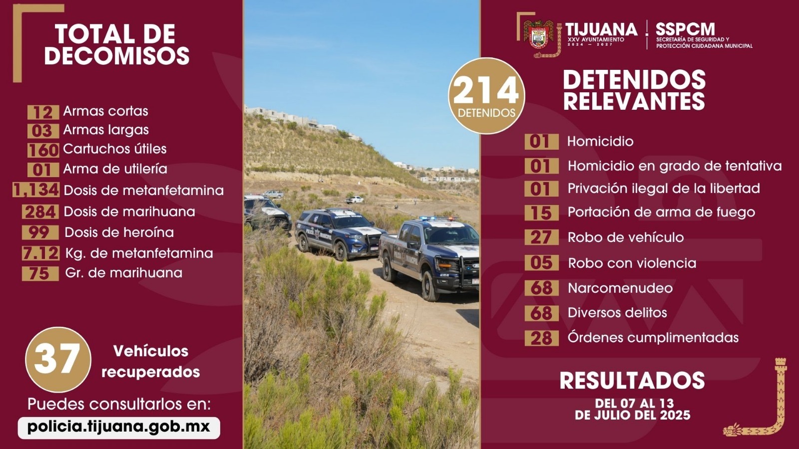 Tijuana, Baja California a 14 de julio de 2025.- La Secretaría de Seguridad y Protección Ciudadana Municipal (SSPCM) informa que durante el periodo del 7 al 13 de julio, fueron aseguradas 214 personas como presuntos responsables de diversos delitos, así como la incautación de 15 armas de fuego.