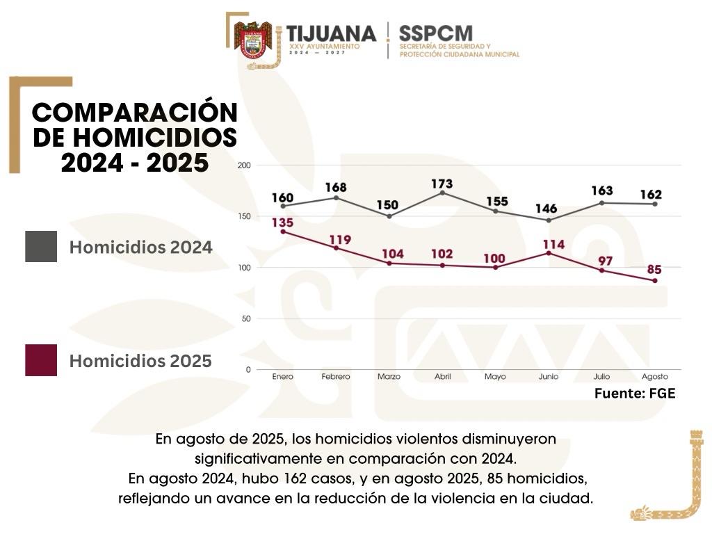 *Tijuana, Baja California a 2 de septiembre del 2025.-* El gobierno del presidente municipal, Ismael Burgueño Ruiz, a través de la Secretaría de Seguridad y Protección Ciudadana Municipal (SSPCM) reporta un avance significativo en la reducción de homicidios dolosos en Tijuana, alcanzando una disminución cercana al 50 por ciento, durante el mes de agosto, en comparación con el mismo mes del año anterior.