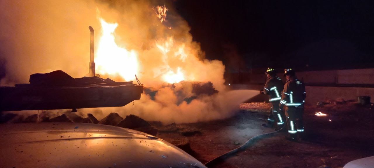 Tijuana, B. C., a 5 de septiembre de 2025.- Durante un recorrido de vigilancia en la colonia La Gloria, oficiales de la Policía Municipal se percataron de un incendio que provenía de una plataforma con pacas de alfalfa, por lo que descendieron de la unidad para realizar una inspección.