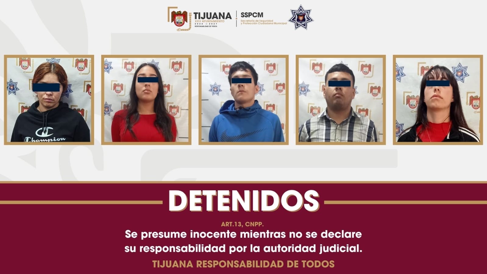 *Tijuana, Baja California a 3 de octubre de 2025.* En un esfuerzo continuo por recuperar la paz y privilegiar la tranquilidad en la población, elementos de la Policía Municipal de Tijuana, en colaboración con la Secretaría de Seguridad y Protección Ciudadana (SSPC) del Gobierno de México, llevaron a cabo la detención de cinco individuos, tres mujeres y dos hombres, como presuntos responsables del delito de portación de armas de fuego. Esta acción se produjo tras el aseguramiento de tres armas largas tipo fusil AK-47, así como 17 cargadores y dos chalecos antibalas.