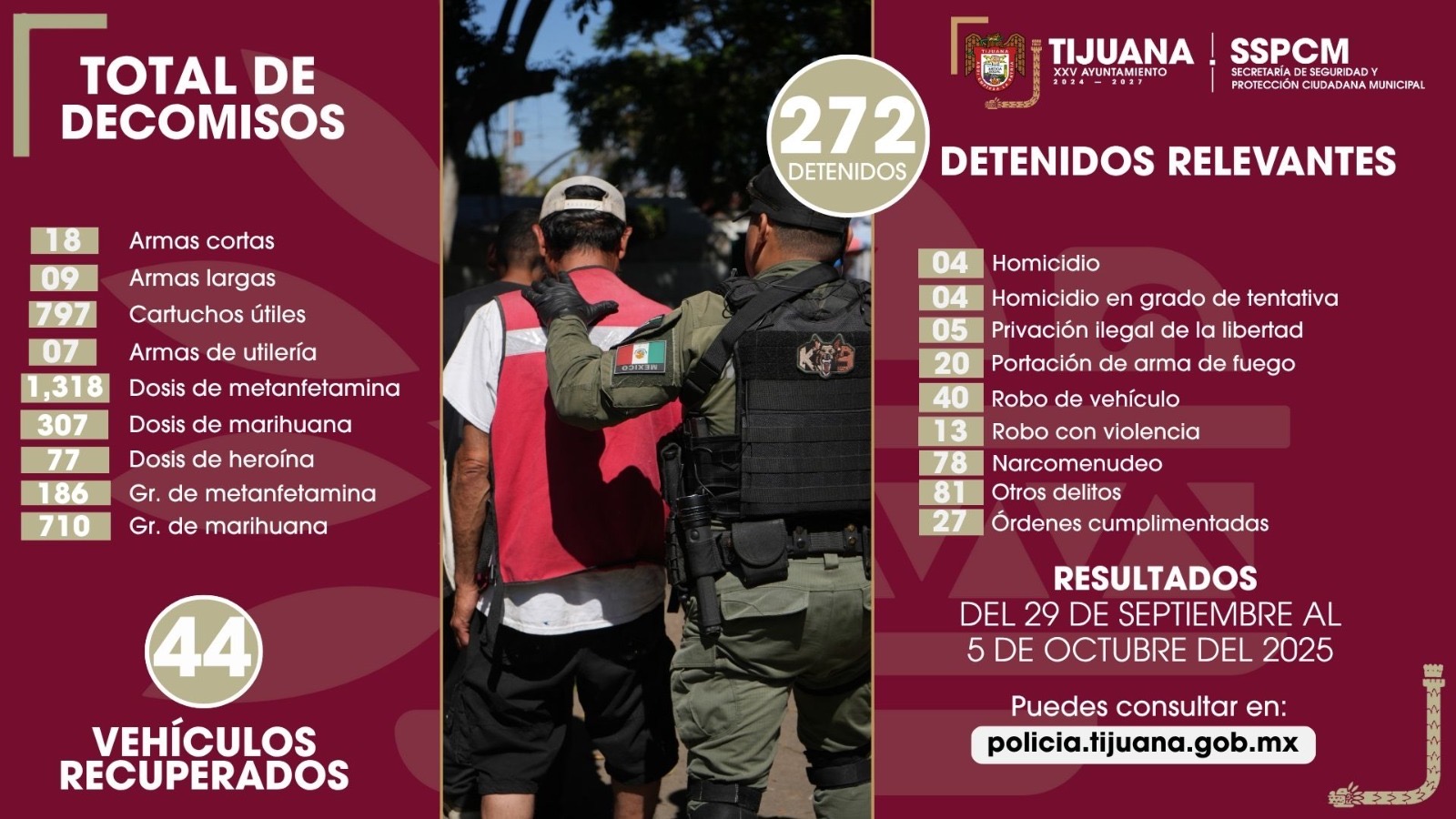 *Tijuana, Baja California a 6 de octubre de 2025.* La Secretaría de Seguridad y Protección Ciudadana Municipal (SSPCM) implementó diversas acciones de prevención y vigilancia que dieron como resultado la detención de 272 personas y el decomiso de 27 armas de fuego durante el periodo comprendido entre el 29 de septiembre y el 5 de octubre.