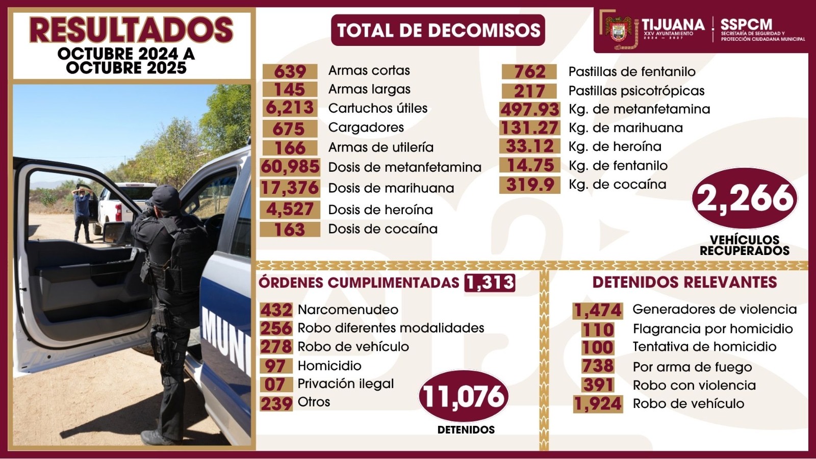 Tijuana.- La Secretaría de Seguridad y Protección Ciudadana Municipal presentó los resultados de octubre de 2024 a octubre de 2025, destacando el fortalecimiento de los operativos preventivos en toda la ciudad.