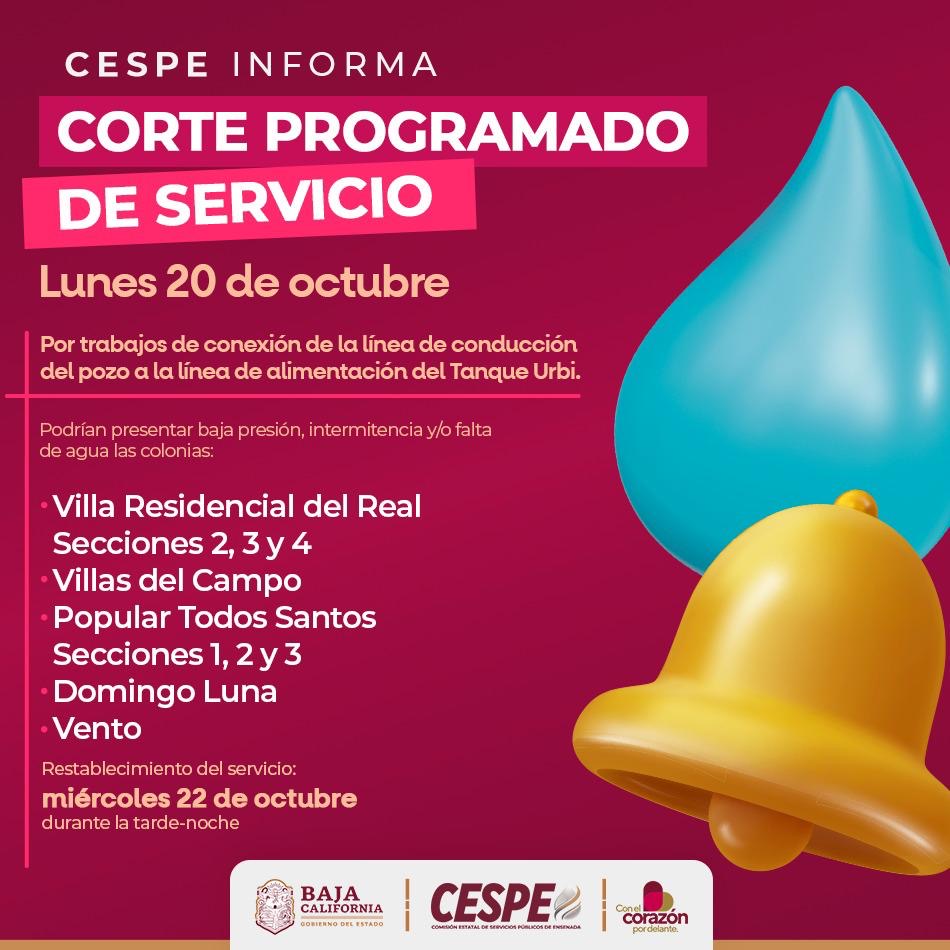 ENSENADA.- La Comisión Estatal de Servicios Públicos de Ensenada (CESPE) informa que el lunes 20 de octubre se realizarán trabajos de conexión en la línea de conducción de agua potable que va del pozo de abastecimiento a la línea de alimentación del tanque de almacenamiento Urbi.
