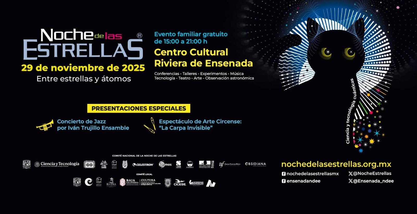 *Ensenada, B. C.-Viernes 21 de noviembre de 2025.-* Con el objetivo de hacer que la comunidad participe en actividades científico-culturales, el Centro Social, Cívico y Cultural Riviera será sede de la “Noche de Estrellas” que organiza la Universidad Nacional Autónoma de México (UNAM), a través del Instituto de Astronomía (IA), en todo el país.