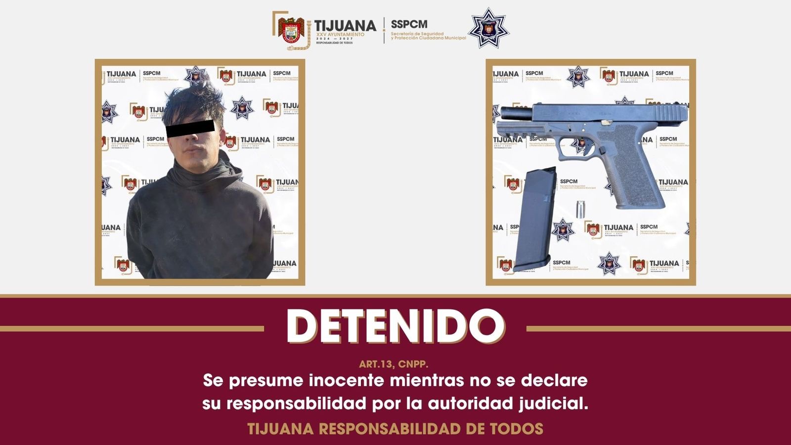 *Tijuana, Baja California a 23 de noviembre de 2025.* La Secretaría de Seguridad y Protección Ciudadana Municipal (SSPCM) llevó a cabo la detención de un persona identificada como presunta responsable de un asalto perpetrado en un comercio situado en la colonia Pedregal de Santa Julia.