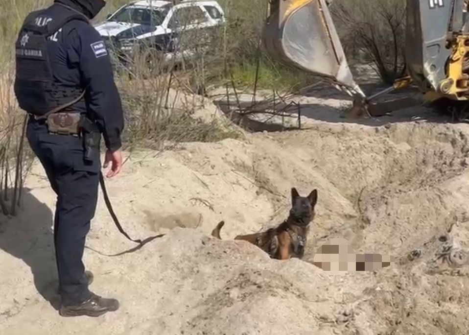 Derivado de la intervención del binomio canino y como parte de los trabajos coordinados, al remover tierra con apoyo de una máquina retroexcavadora se localizó una extremidad inferior, correspondiente a un pie izquierdo, procediéndose de inmediato al acordonamiento del área conforme a los protocolos establecidos.