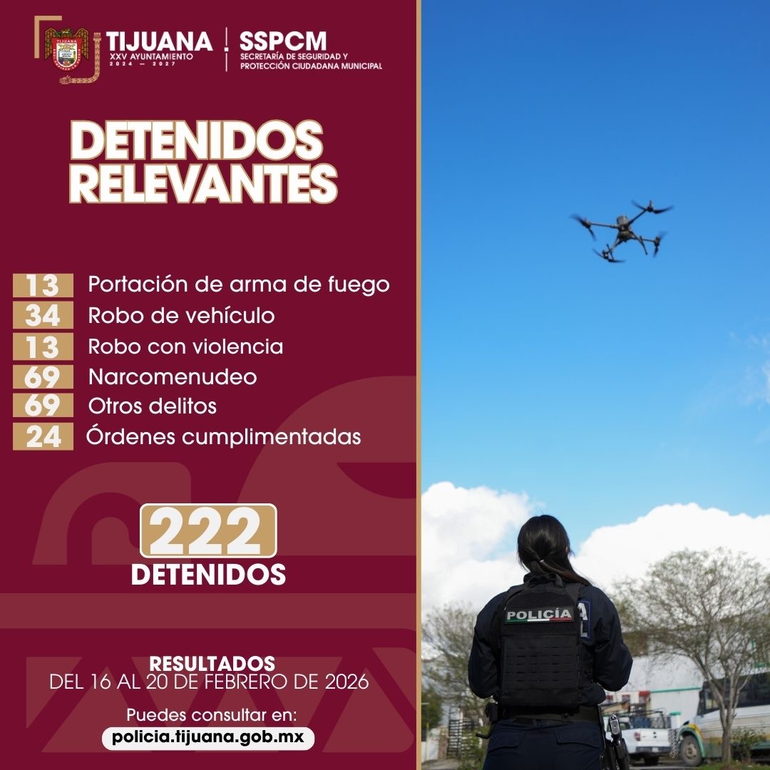 *Tijuana, Baja California, a 23 de febrero de 2026.* Como resultado de los trabajos de estrategia integral de seguridad implementada bajo la dirección del presidente municipal de Tijuana, Ismael Burgueño Ruiz, para la recuperación de la paz y la tranquilidad en la ciudad, la Secretaría de Seguridad y Protección Ciudadana Municipal (SSPCM) llevó a cabo una serie de acciones efectivas que resultaron en el aseguramiento de 222 personas presuntamente involucradas en diversos delitos, entre el 16 y el 20 de febrero.