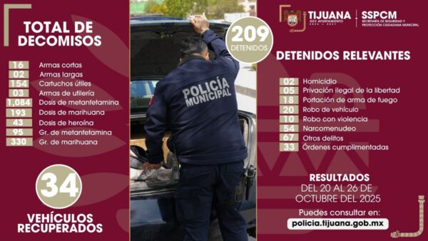 *Fortalece SSPCM acciones de seguridad con más de 200 personas detenidas en una semana* *Tijuana, Baja California a 27 de octubre de 2025.*...