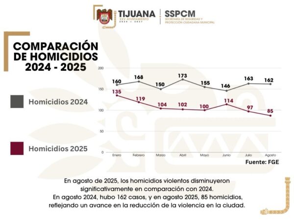 *Reporta Gobierno Municipal disminución en homicidios dolosos durante agosto en Tijuana* *Tijuana, Baja California a 2 de septiembre del 2025.-* El gobierno del...