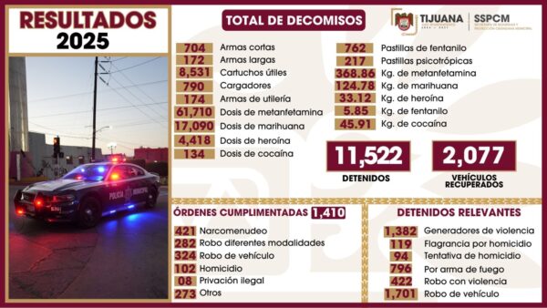*Logra Policía Municipal de Tijuana importantes resultados durante el 2025* Tijuana, Baja California a 5 de enero de 2026.- La Secretaría de Seguridad...